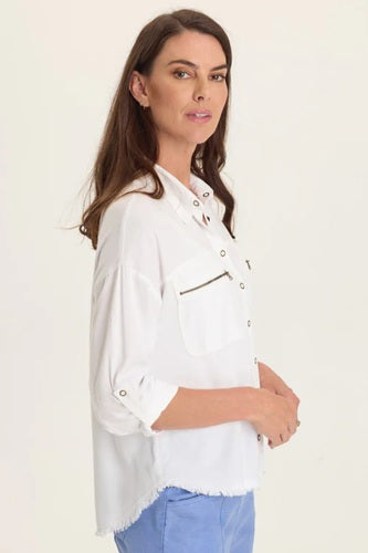 Tabbed three-quarter sleeves, zippered breast pockets, and a collar lend a classic touch to this snap front blouse, while a raw-edge hem rounds out this utility-inspired cargo shacket.