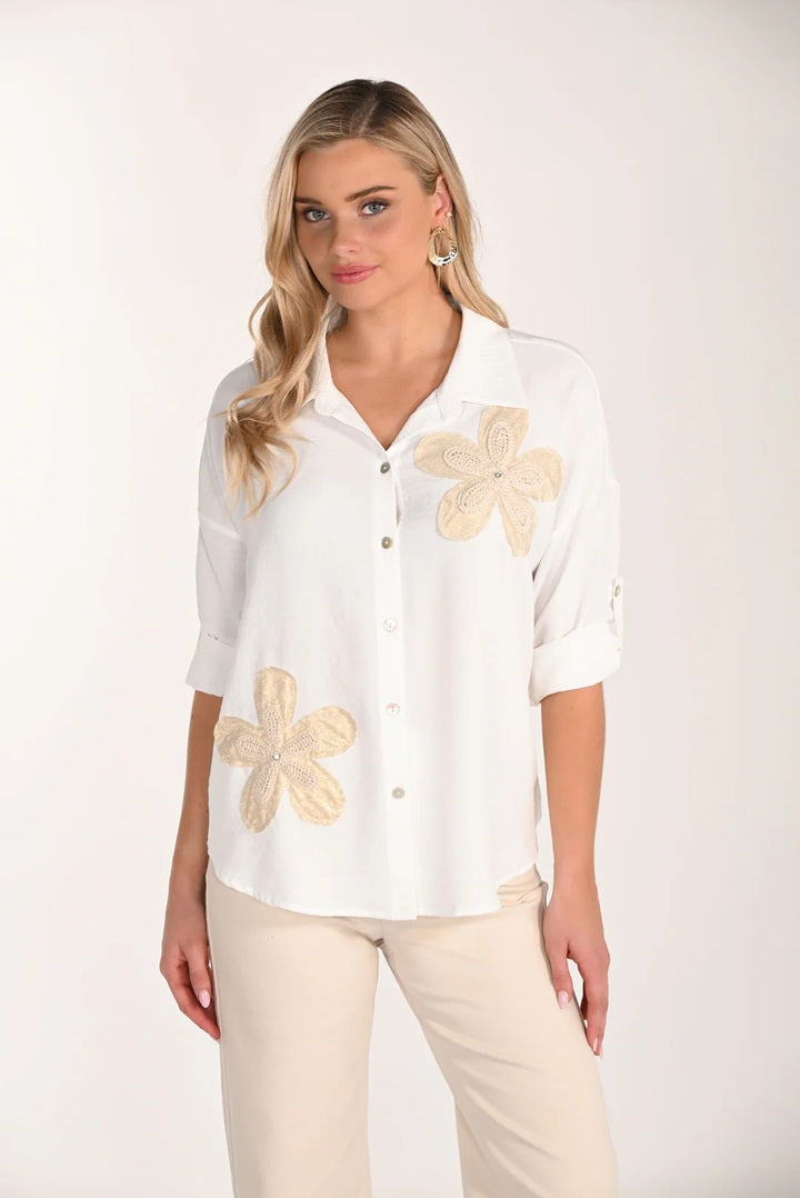 This floral embroidered blouse delivers understated sophistication for warm-weather styling. This top has a flattering cut that transitions seamlessly from casual outings to relaxed social gatherings. Delicate embroidery elevates the botanical print, while functional 3/4 roll-up sleeves adapt to temperature shifts throughout the day. A structured collar and button front provide polished finishing touches that anchor the piece within a versatile wardrobe. This shirt balances refined detailing with effortless wearability.