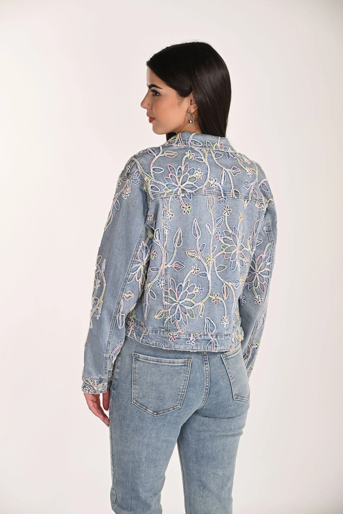 This denim jacket blends casual comfort with feminine sophistication. Crafted from a soft woven cotton‑poly blend, it offers a flattering hip‑length silhouette with a classic button‑front closure and a clean, structured fit. The collared neckline and long straight sleeves elevate the look, while the delicate floral embroidery adds a refined, stylish touch. Perfect for everyday wear, weekend outings, or semi‑casual gatherings, this jacket brings effortless charm to any outfit and transitions seamlessly across seasons.