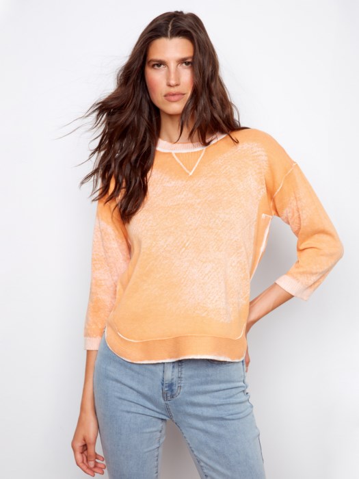 Reverse print sweater with three quarter sleeves in apricot with a curved hemline from Charlie B
