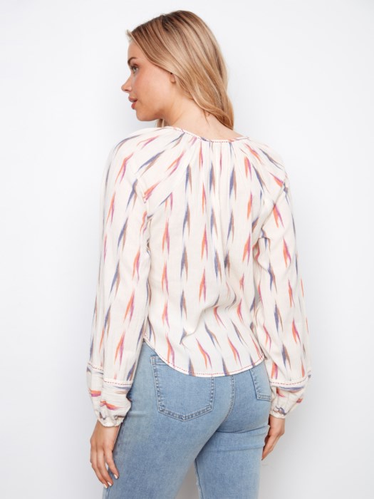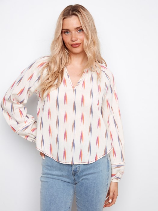 Cotton raglan style long sleeve top with an ikat pattern from Charlie B