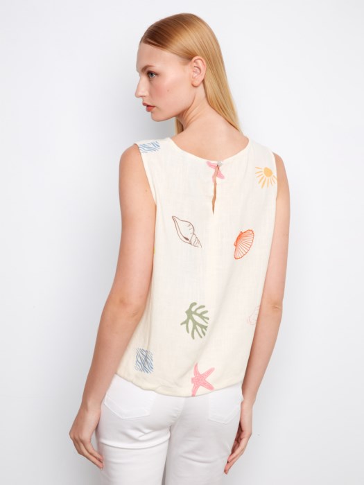 Ecru based sleeveless top with a whimsical seashell pattern and a drawcord at the bottom hem from Charlie B