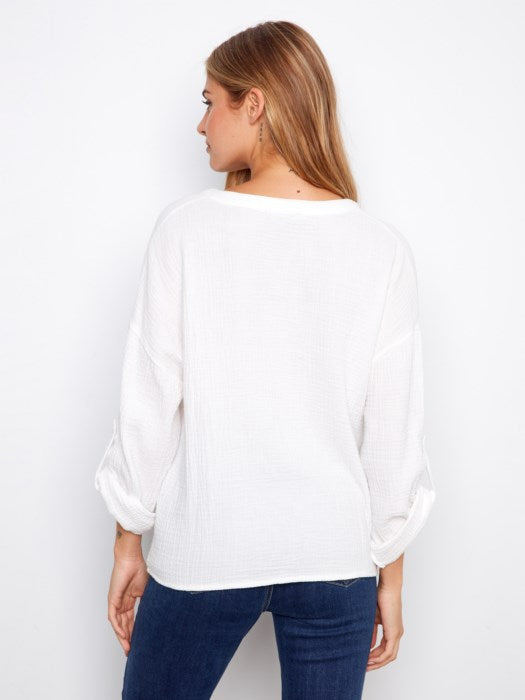 White cotton gauze top with three quarter sleeves with a twist front detail from Charlie B