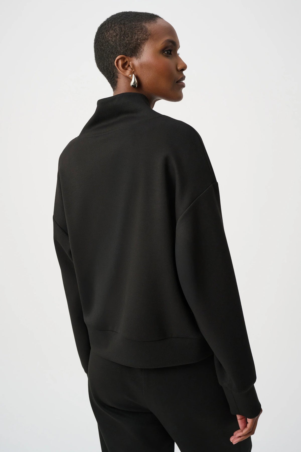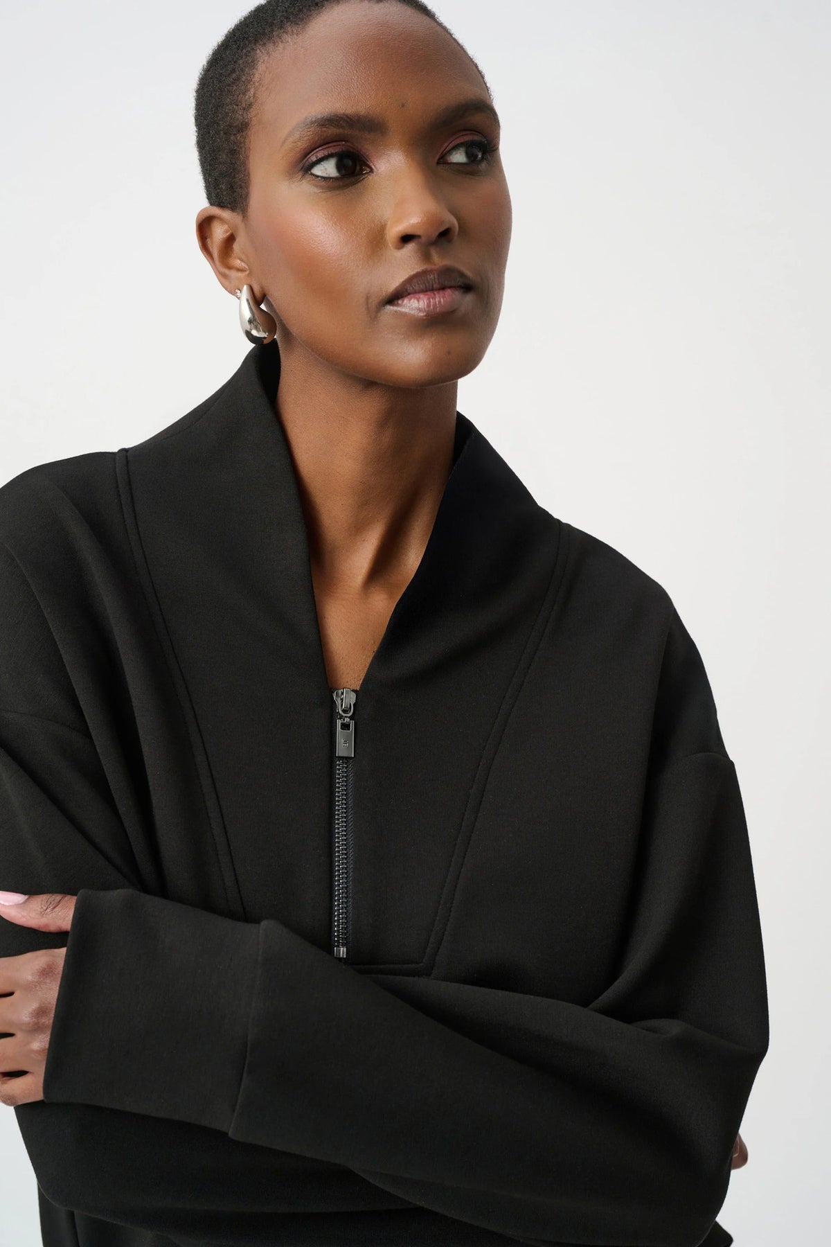 This scuba jersey sweatshirt adds a sleek edge to a laid-back silhouette. Designed with a high collar, V-neckline, and front zipper, it blends comfort and structure in an easy boxy fit.