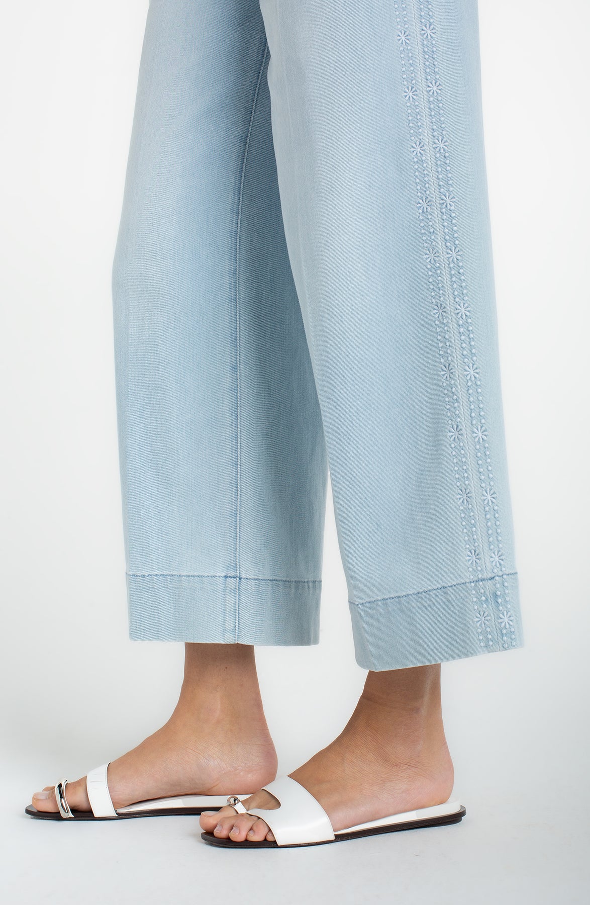 Fresh, modern, and effortlessly chic, this jean brings a polished twist to everyday denim. Designed with a flattering mid-rise and a cropped wide-leg silhouette, this style offers comfort with a fashion-forward edge. The delicate embroidery along the side seam of these jeans add an elevated touch, while the light wash keeps the look clean and versatile.