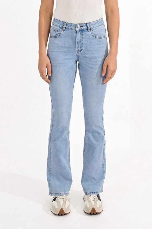 High-waisted bootcut jeans with a 32" inseam sport a light summer wash. Traditional front pockets and back patch pockets keep these jeans functional for everyday wear.