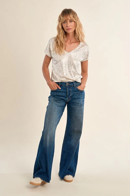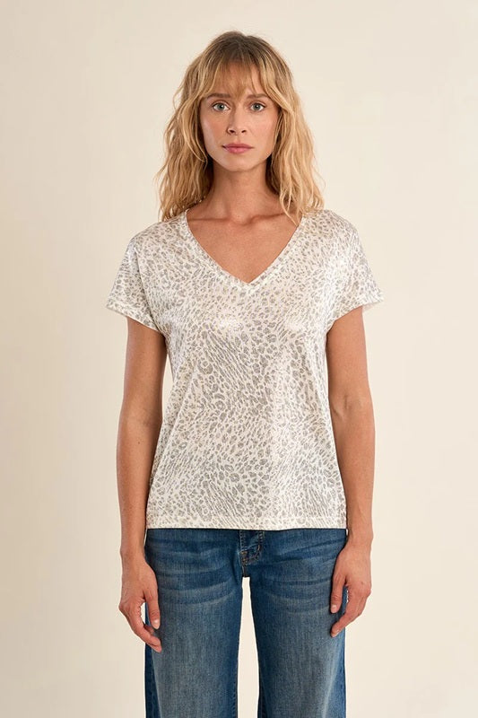 Off white dolman style iridescent t-shirt with cap sleeves. this V-neck short sleeve top features an all over leopard print.