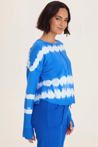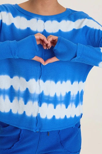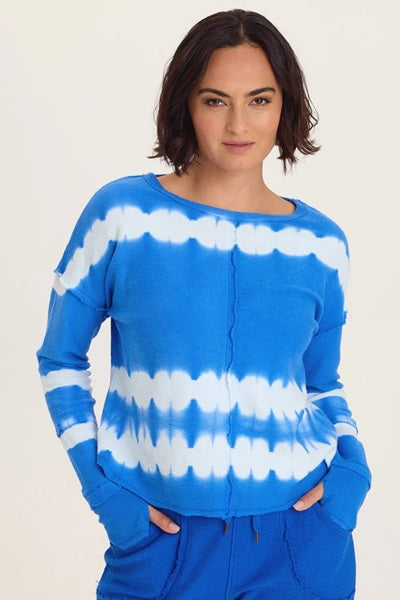 The raw edge details make this top a great everyday piece. The boat neck and long sleeves with thumb holes give a touch of edge to this comfortable cotton top.