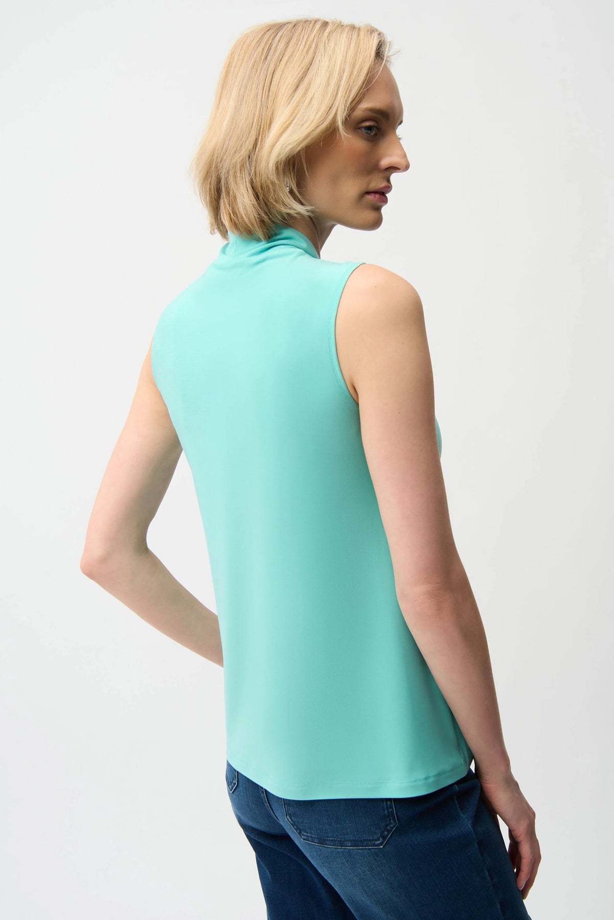 Light and flowy, this silky knit trapeze top features a flattering V-neckline and a sleeveless cut, offering easy movement and timeless versatility for day or night styling.