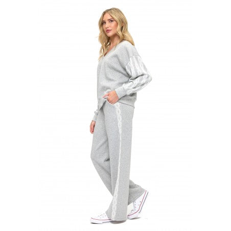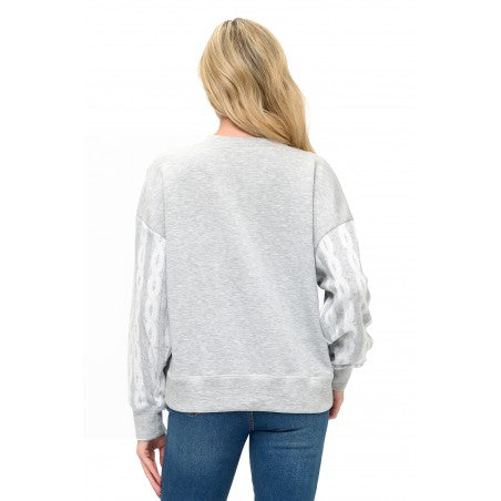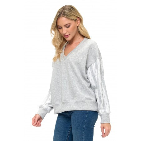 Light gray drop shoulder long sleeve top with patterned knit sleeves and a V-neck.