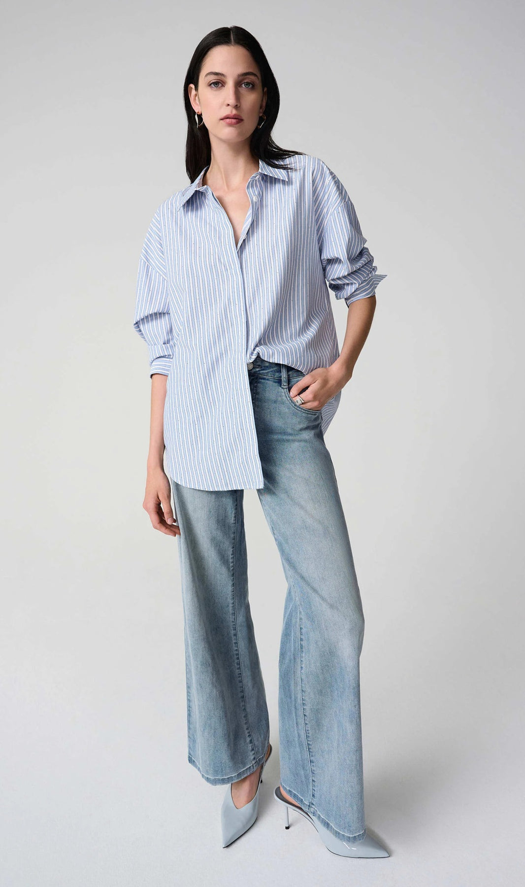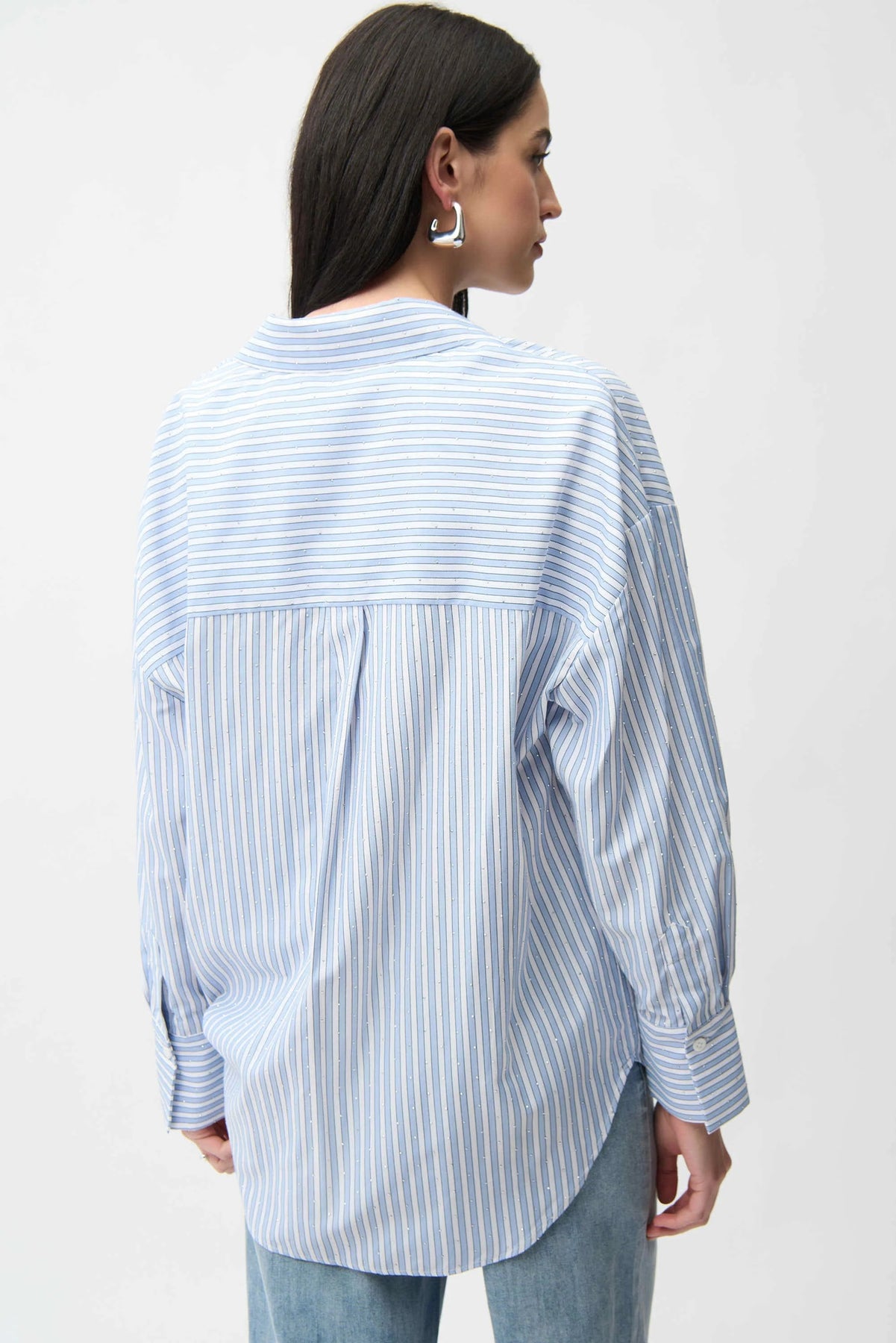 Crafted from lightweight Tencel, this woven blouse features a striped pattern and a boxy drop shoulder silhouette with a hidden button placket. All-over rhinestone details add a unique touch to this casual piece.