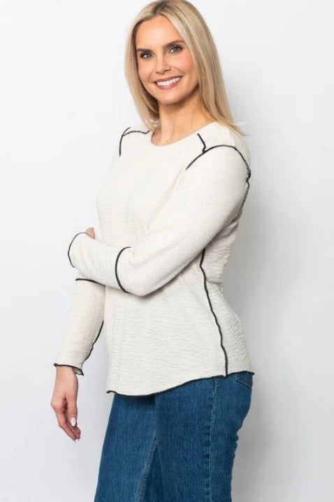 Seersucker long sleeve top with a crewneck with contrasting threads on the exposed seams from Sno Skins