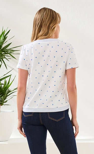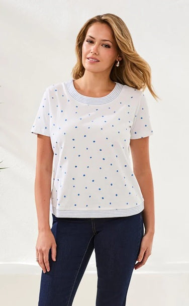 Refined with delicate polka dot embroidery, this short sleeve top features a crew neckline and a relaxed fit. The double yarn jersey feels soft against the skin, ensuring both comfort and effortless style for everyday.